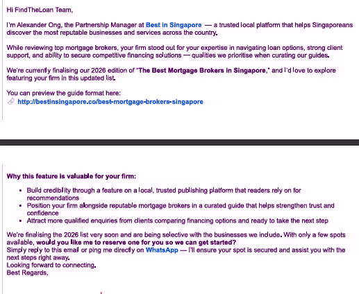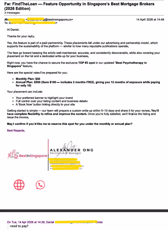 Pay, and you can secure visibility on the list. And the best thing? They asked us initially if we wanted to be featured as the best mortgage broker. And when we asked, "Are we required to pay?" They asked us to reserve the spot for the best psychotherapy in Singapore!? ๐ญ So can you even trust their reviews just took another dent.